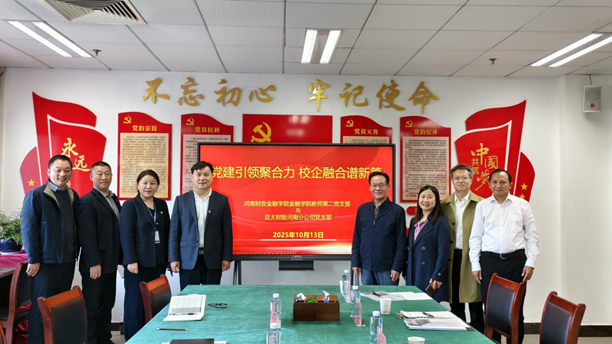 为深化校企合作,以高质量党建引领事业高质量发展,10月13日下午,金融学院教工第二党支部与亚太财险河南分公司党支部于学院4楼会议室成功举办党建联建活动。活动以“党建引领促发展,校企融合谋新篇”为主题,旨在通过支部共建,打通产教融合关键环节,共同探索人才培养与产学研合作的新模式。活动由教工第二党支部书记黄祖梅主持。