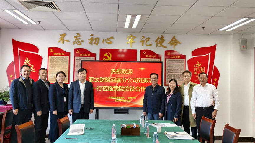 10月13日下午,亚太财产保险有限公司河南分公司总经理刘振功一行3人莅临金融学院。学院领导班子成员及部分教师代表与来访客人进行了座谈交流。